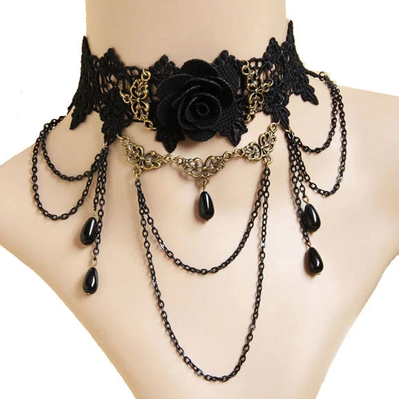 Black Lace Choker with black chain detailing and central black fabric rose detail bordered by antique bronze tone flourishes with black teardrop beads below. The necklace fastens with a lobster clasp and extender chain for adjustability.