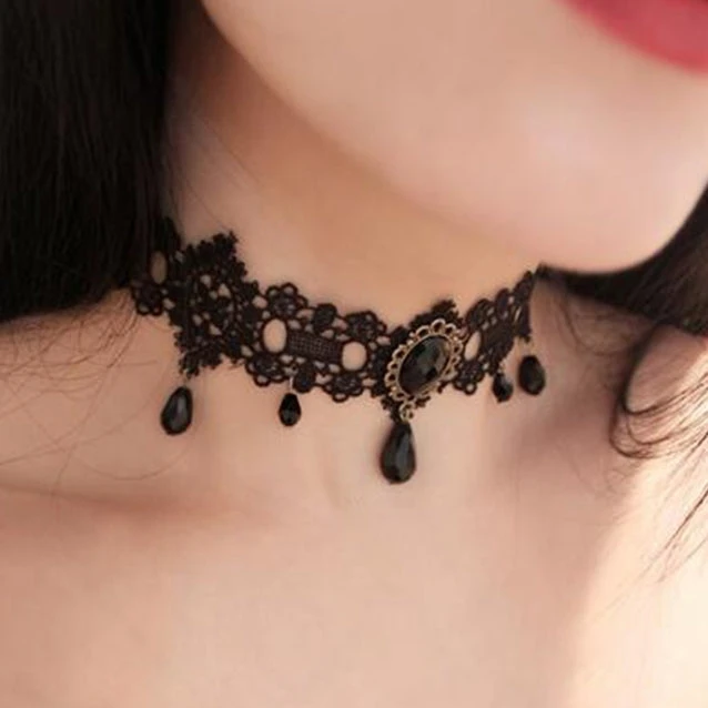 Black Holey Lace Gothic Choker with central black faceted cabochon set in an ornate antique bronze tone frame with black faceted teardrop beads below.