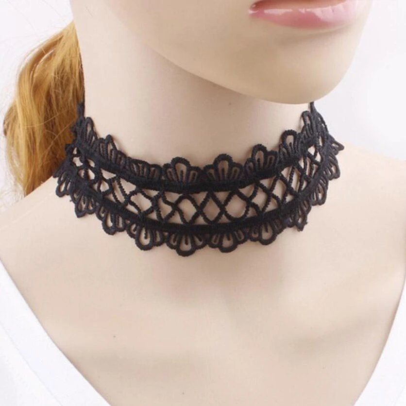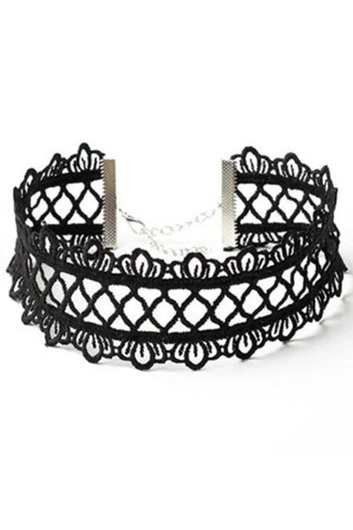 This simple but elegant black lace choker features a criss cross pattern in the centre with petal shaped scalloped edges.