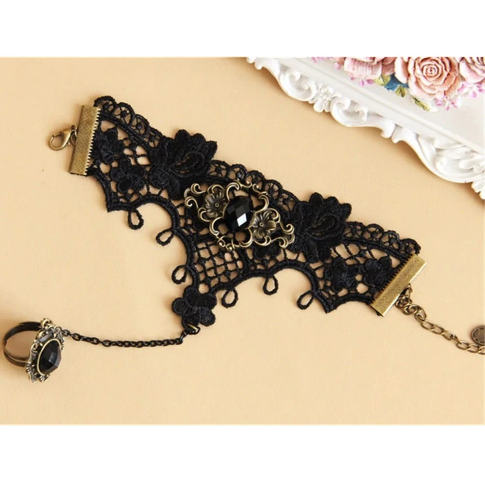 This beautiful Black Lace Slave Bracelet has an ornate bronze tone filigree plate in the centre with black faceted oval cabochon. A black chain leads to an adjustable ring with another oval faceted cabochon in the centre.