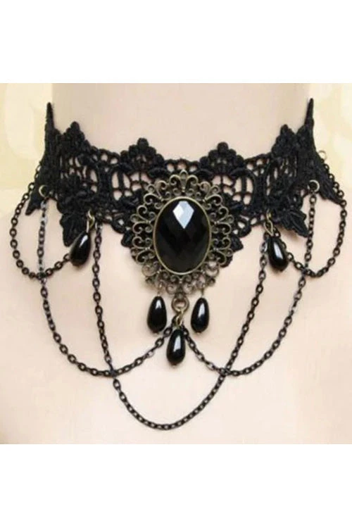 Black Lace Gothic Choker with black chain detailing and central black faceted cabochon set in an ornate antique bronze tone frame with black teardrop beads below.