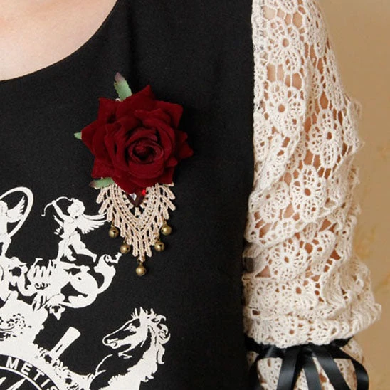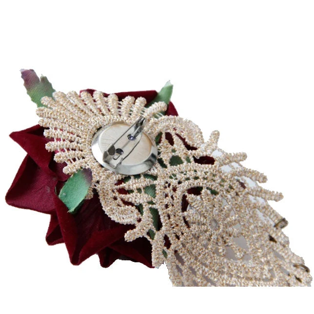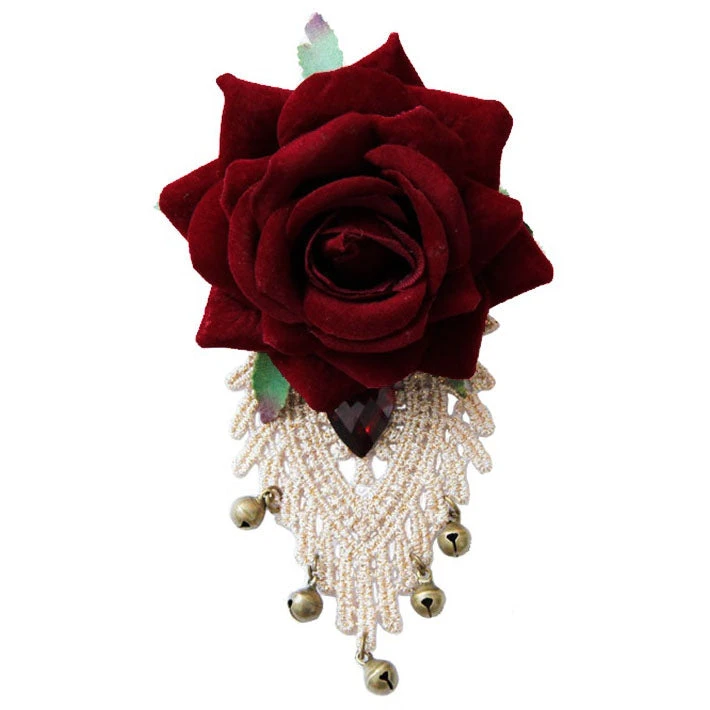 Beautiful Sparkly Ivory Lace Steampunk brooch pin with dark red flocked fabric rose in the centre, red acryric cabochon and antique bronze tone bells dangling from the edges.