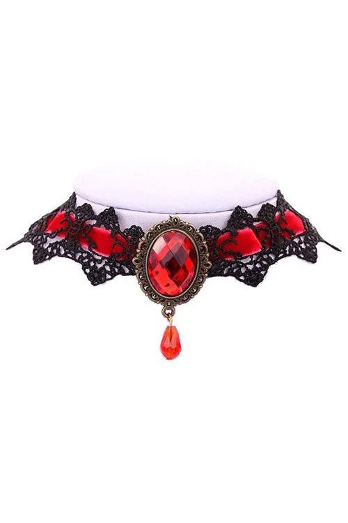 Beautiful Black Lace Gothic Choker woven with dark red velvet ribbon featuring a central ornate antique bronze tone oval frame and red faceted gem cameo and faceted teardrop bead dangle.