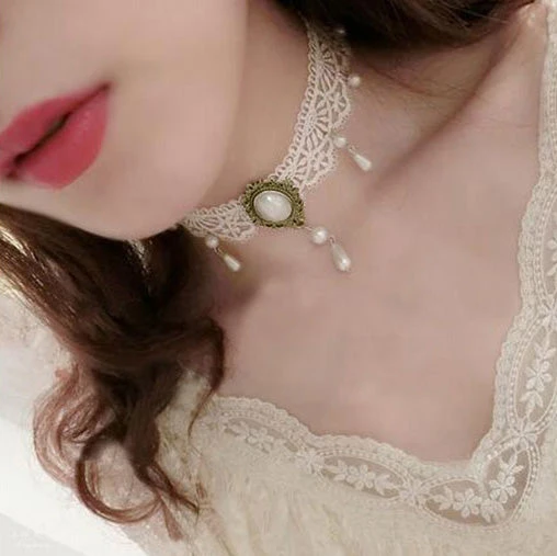 Beautiful white lace steampunk choker with oval pearl effect cabochon in the centre, set in an antique bronze tone frame with spherical and teardrop pearl effect beads dangling below.