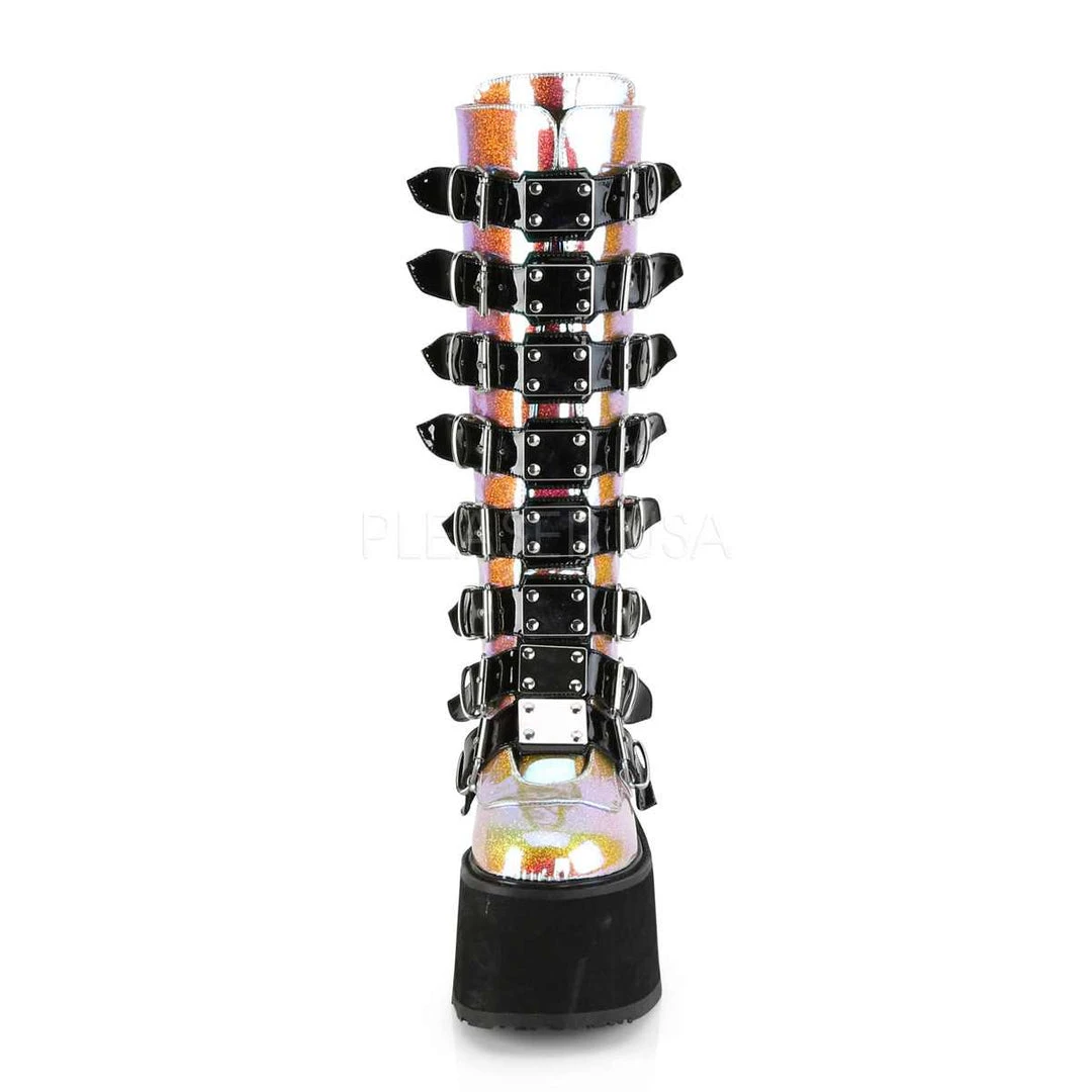 3 1/2″ (90mm) Platform Knee High Boot Featuring 8 Buckle Straps with Metal Plates at Center, Back Metal Zip Closure.