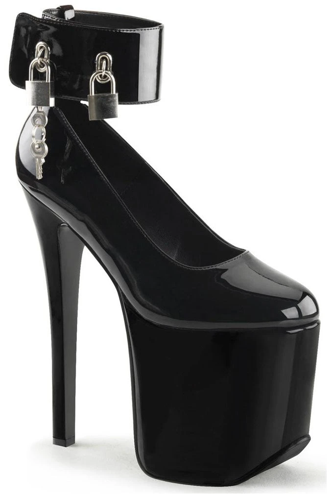 Devious Black Patent PVC Shoes with Cuff TRAMP-742. 7 1/4″(18.4cm) Heel, 4 1/4″(10.8cm) Platform Pump Featuring Wide Ankle Band with Padlocks.