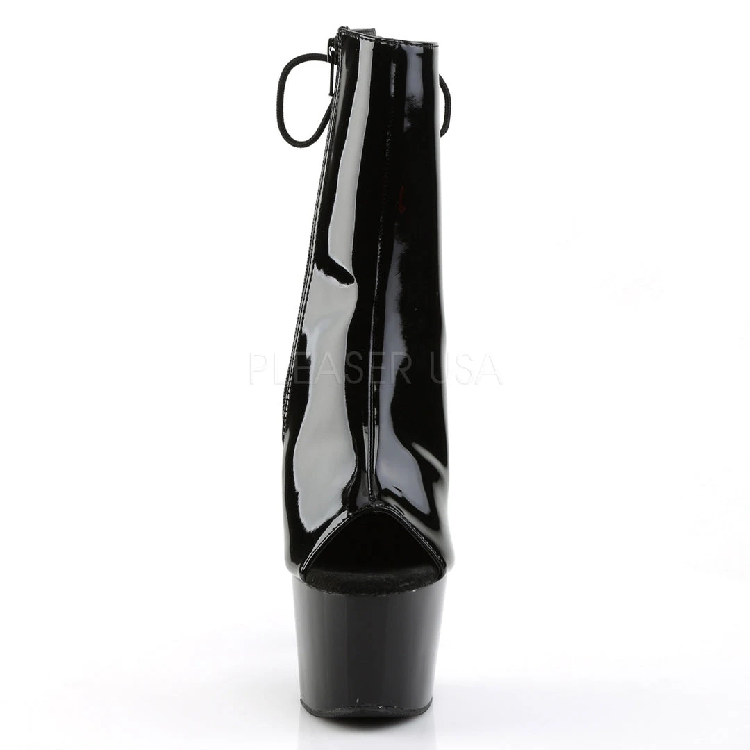 7″ (178mm) Heel, 2 3/4″ (70mm) Tinted Platform Open Toe/Heel Lace-Up Back Ankle Boot Featuring Holographic Lines on the Upper, Inside Zip Closure.