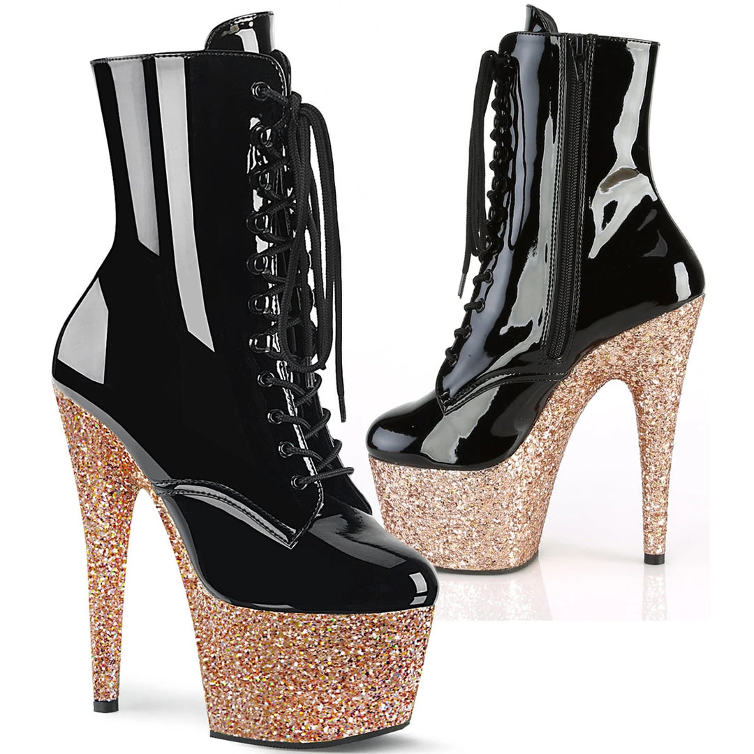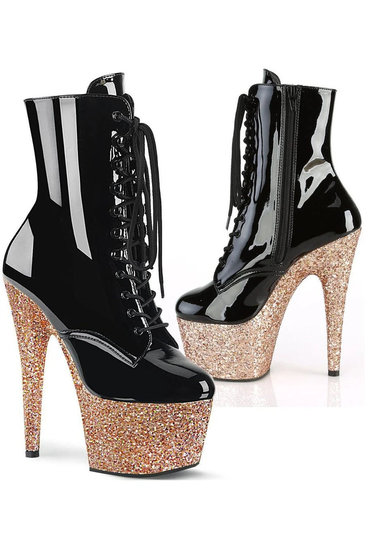 Pleaser Black Patent PVC with Rose Gold Multi Glitter Heels ADORE-1020LG Boots.