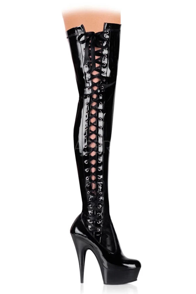 6″ (15.2cm) Stiletto Heel, 1 3/4″ (4.5cm) Platform Side Lace-Up Side Stretch Thigh High Boot, Full-Length Inside Zip Closure.