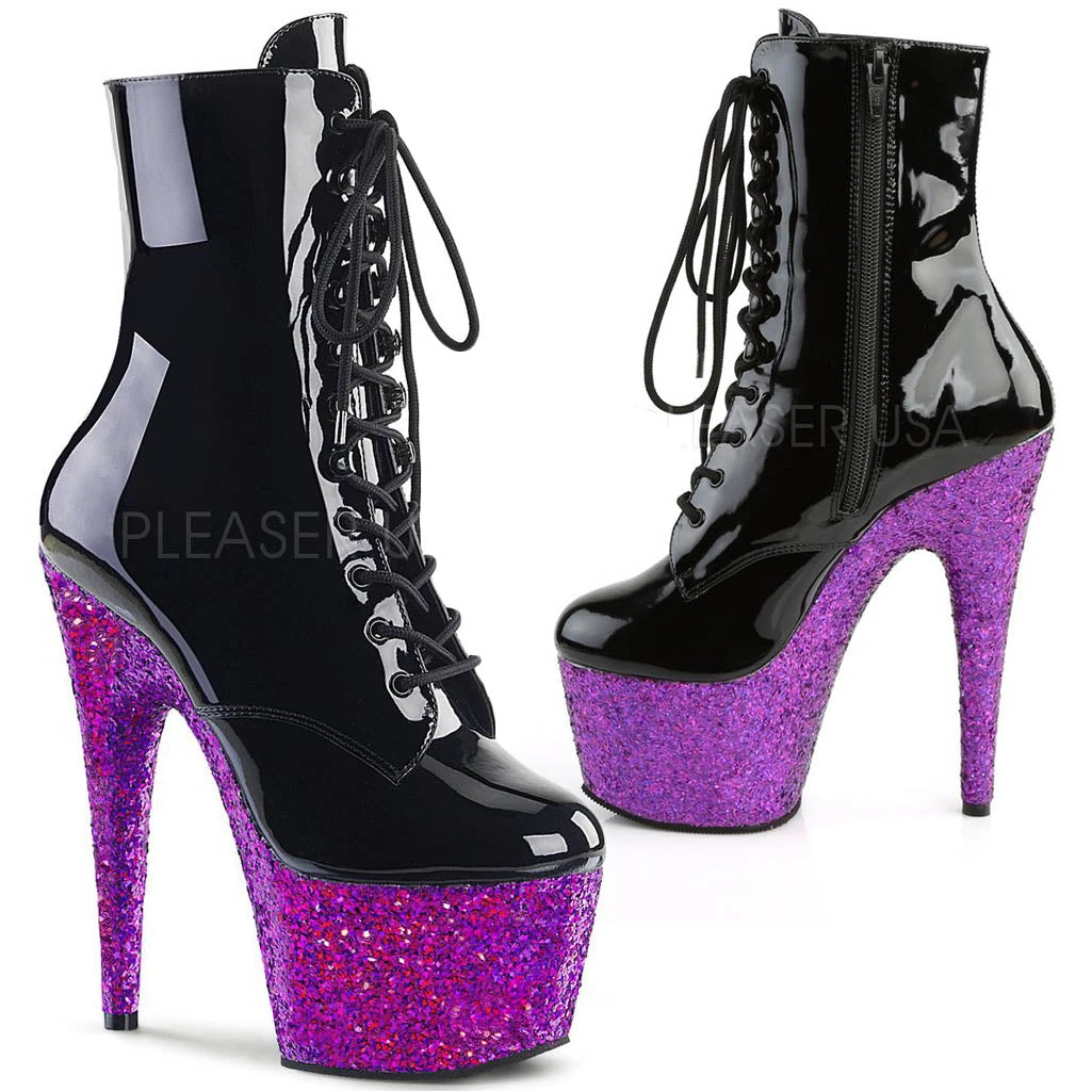 Pleaser Black Patent PVC with Purple Multi Glitter ADORE-1020LG Boots.
