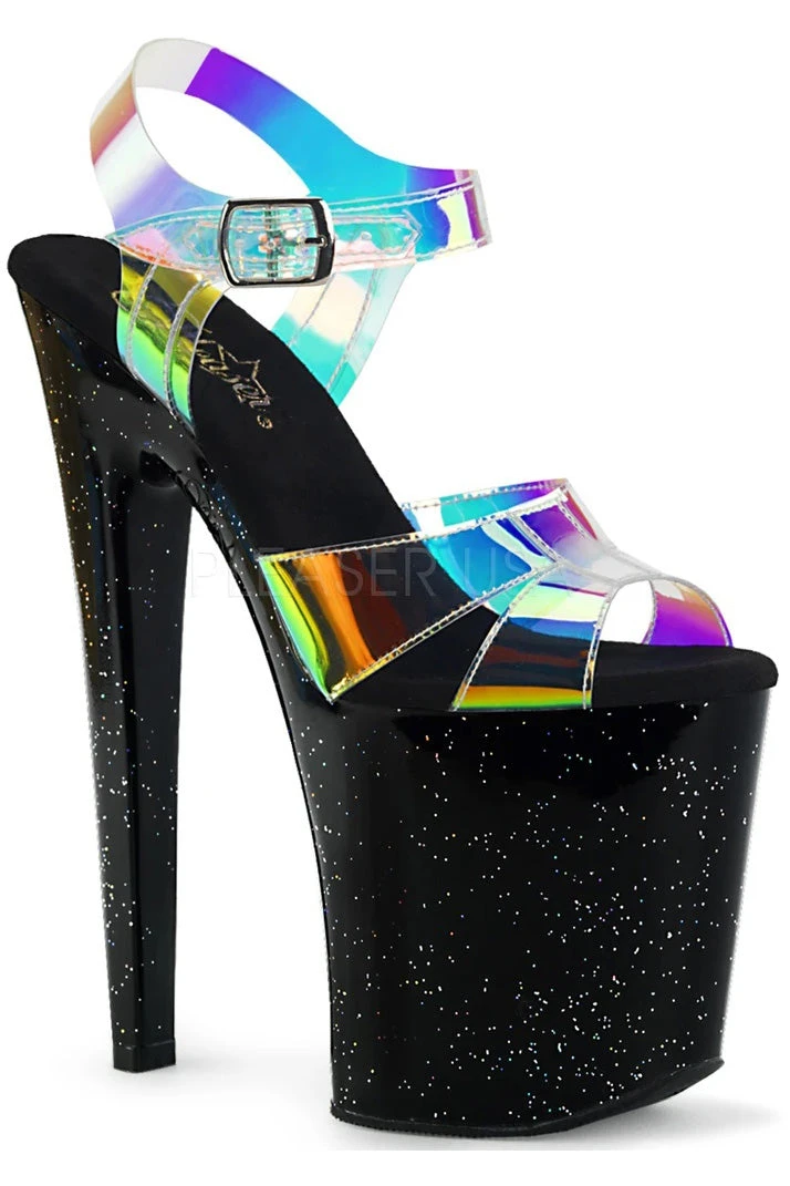 8″ (200mm) Heel, 4″ (100mm) Platform Ankle Strap Sandal Featuring Mini Iridescent Glitters on the Entire.
