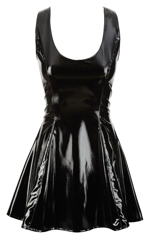 Absolutely stunning! This black vinyl mini dress with a flared skirt part looks amazing because it is low cut at the front and the back. With a zip at the back. Material: 100% polyester with a polyurethane coating.