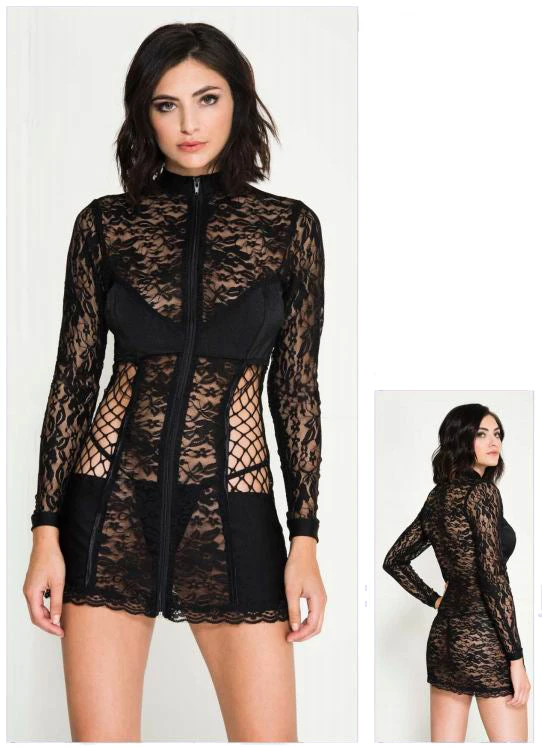 Zipper front lace long sleeve mini dress with side fishnet panels.