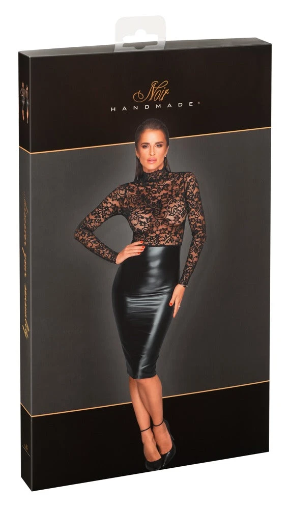 Exciting noble style! Knee-length long-sleeved dress in a tight, tailored cut in a noble black mix of soft lace (top) and matt shiny Powerwetlook (skirt part). Small stand-up collar to close with 2 buttons at the back. Small slit in the back hem.