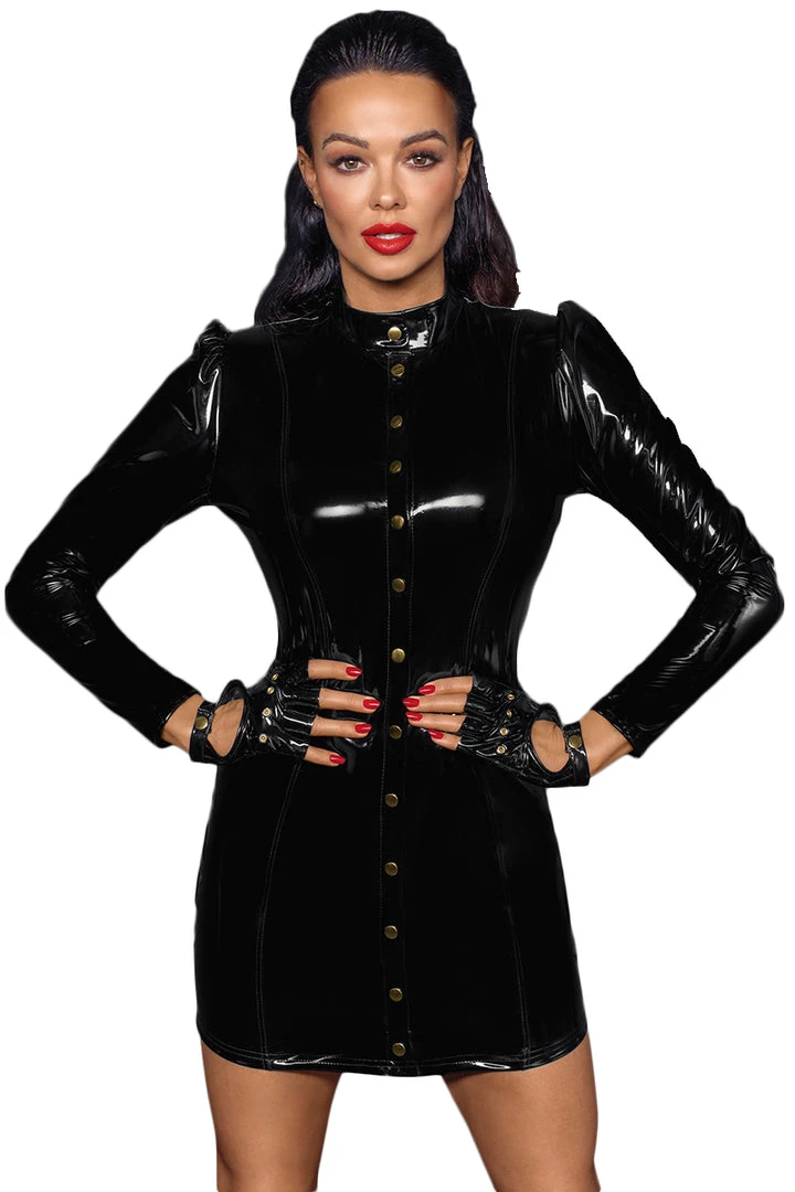 Short PVC dress with puffy shoulders and long sleeves, fastened at the front all the way from the collar to the bottom hem with gold clasps. A classy and trendy look perfect for any party.