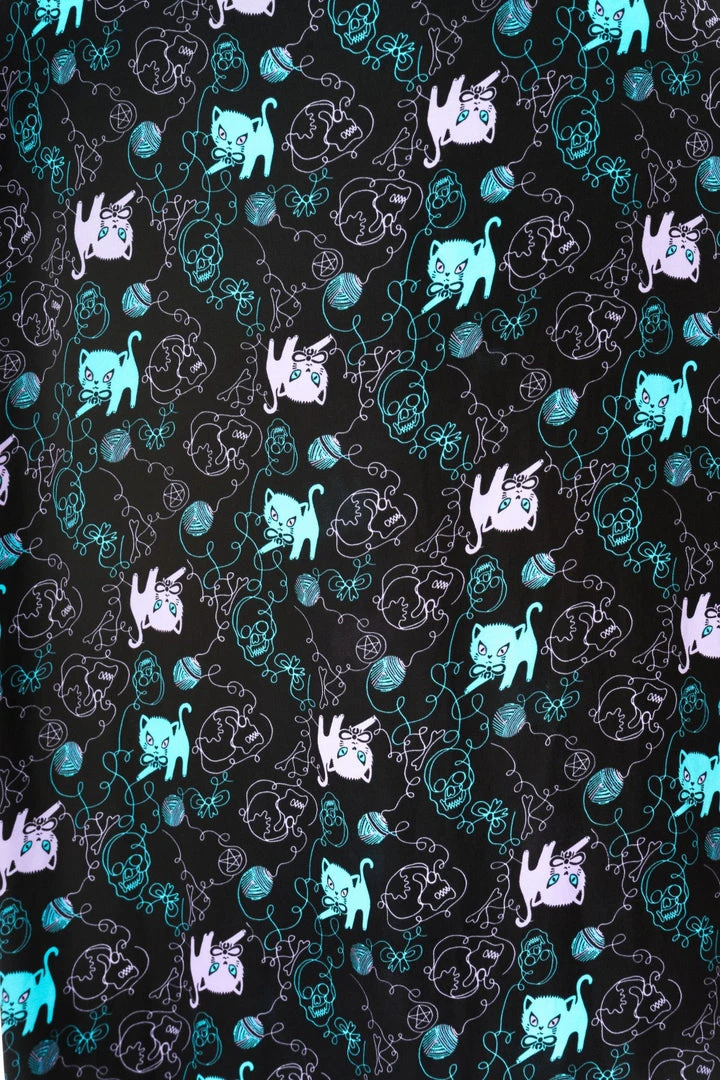 This fun sleeveless maxi dress is made from a lovely floaty polyester elastane mix with a silky chiffon feel to it. The dress has flattering underbust seams and flares out below. There are gathers at the shoulders, v-neck cut to the neckline and keyhole cut out at the back with double button fastening at the back of the neck. The dress also fastens with a hidden side zip and has a black lining layer to around mid-thigh length. The super cute print features turquoise and blue kittens playing with balls of wool which have unravelled to form skulls and bows! A fabulous quirky design for the warmer months!