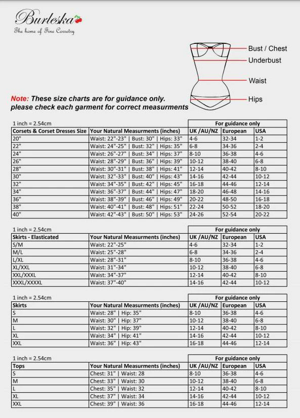 Please note this dress is sized in corset measurements – waist size in inches of the corset dress when fully closed. It is generally recommended to order a size between 2 and 4 inches below your natural waist size.