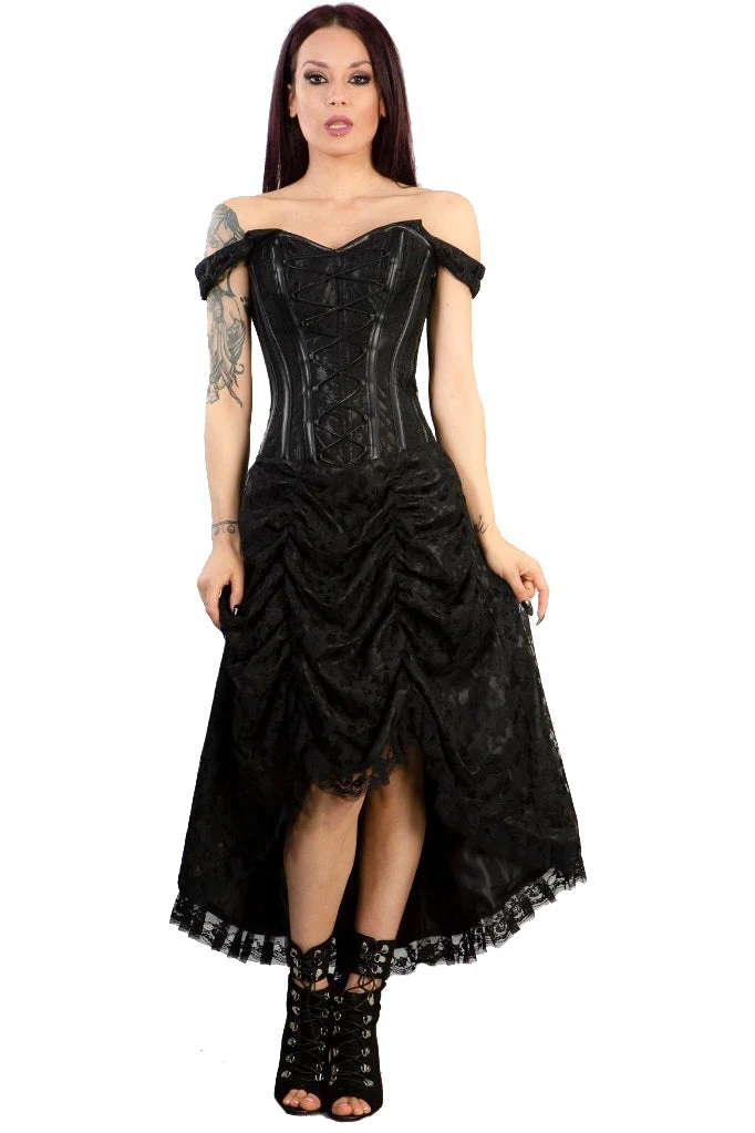 Passion corset dress in black satin and black satin lace overlay skirt with lace frill around. Black matt corset details and lace fastening on the back. Perfect for special occasions. Unleash your dark side with that gorgeous off shoulder dress.