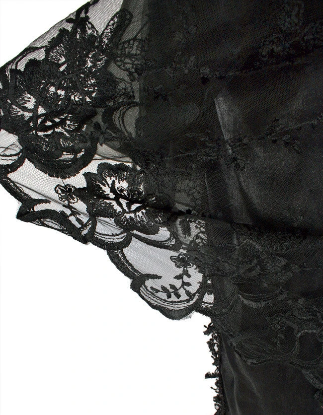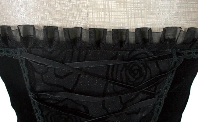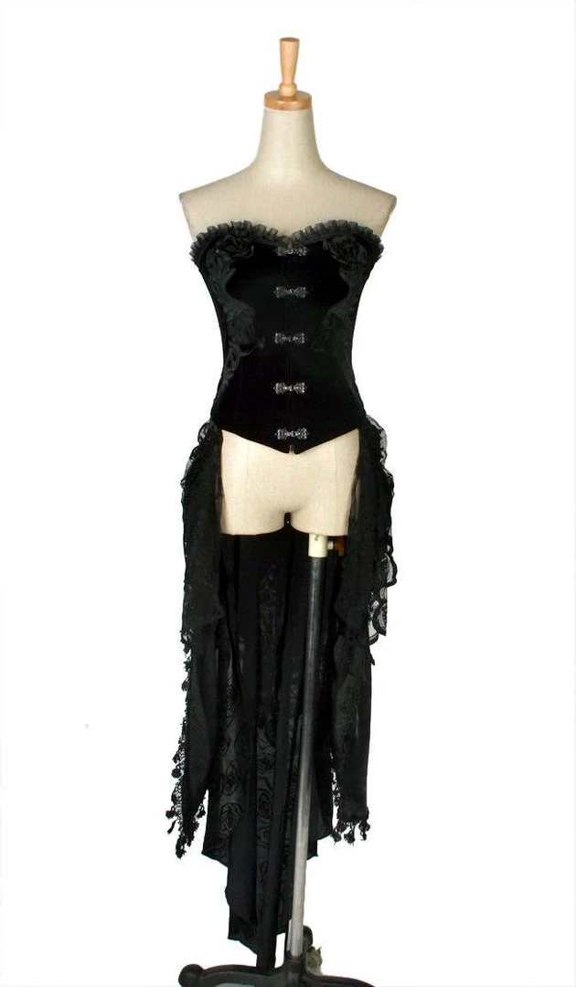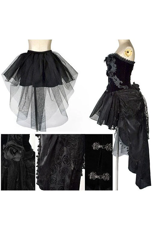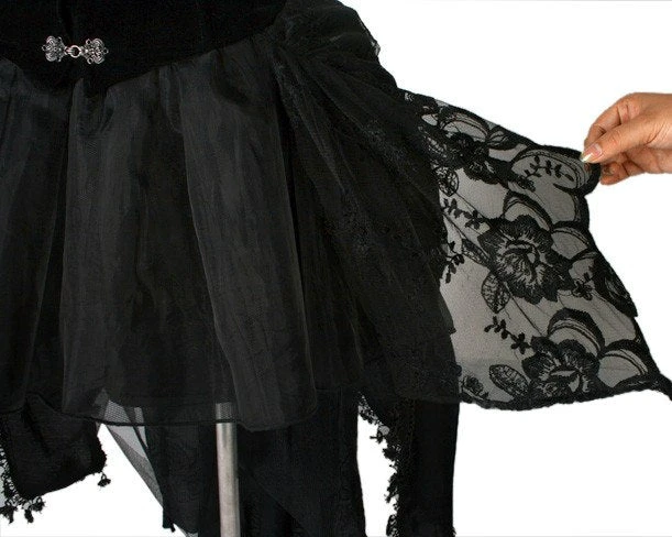 The gothic skirt section consists of three layers, top layer lace over twin shimmer tails with decorative edging over rose decorated bottom layer.