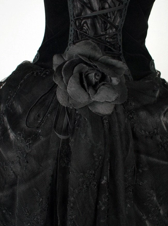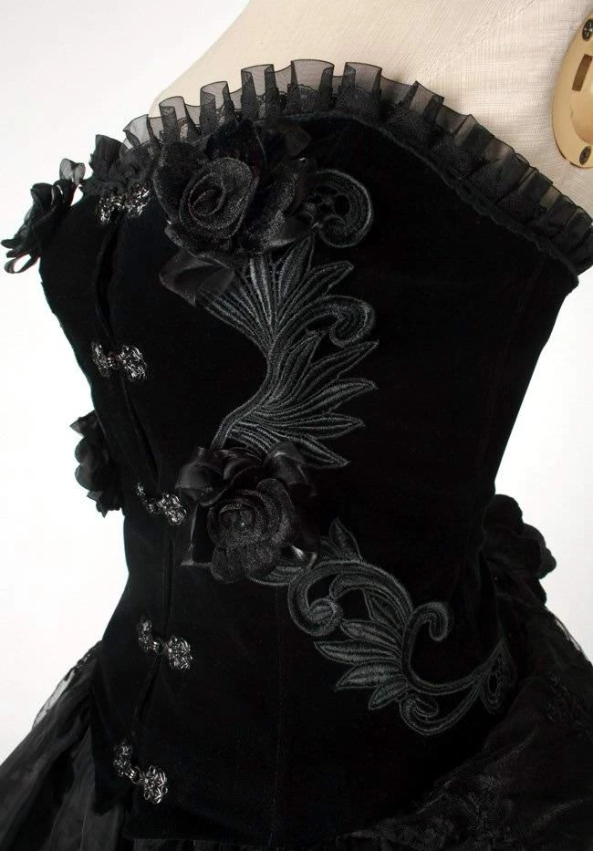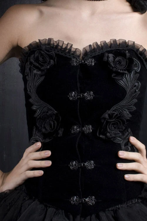 This gothic black velvet corset dress top has an upper corset section with light boning, decorative metal front clasps and decorative embroidered sections with attached black roses. The velvet gothic dress corset top has rear lacing over a rose decorated back section with attached decorative rose and top lace edging.
