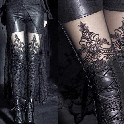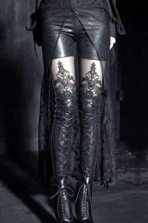 These stunning black Gothic Embossed Leggings are made from a stretchy rubberlook / wetlook type fabric embossed with a paisley pattern design. They have black braiding detail down the side of each leg and corset style lacing with black velvet ribbon on the front of the lower legs. There are black lace panels on the thigh, adorned with a black embroidered pattern which almost gives the impression of stockings worn with shorts or hotpants. This very sexy item will be great for any Goth Look! Available in Small to XXL