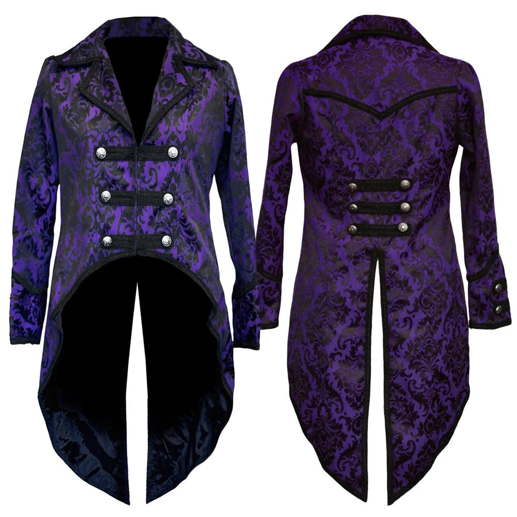This eyecatching purple and black brocade Gothic tailcoat is suitable for both ladies and men. with black braiding detail and decorative silvertone buttons in a military style at the front and on the waist bar at the back. This fabulous gothic jacket fastens at the front with hidden hook and eye closures.