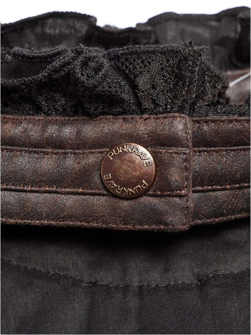 Viscount black jabot by Punk Rave. Gothic style black and brown jabot made of black ruffled laces and brown synthetic vegan leather with a bronze buckle at the front. Jabot fastened by press-stud at the back.