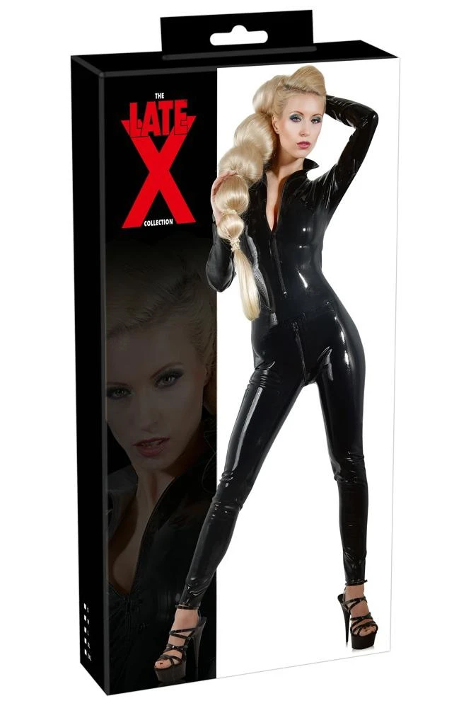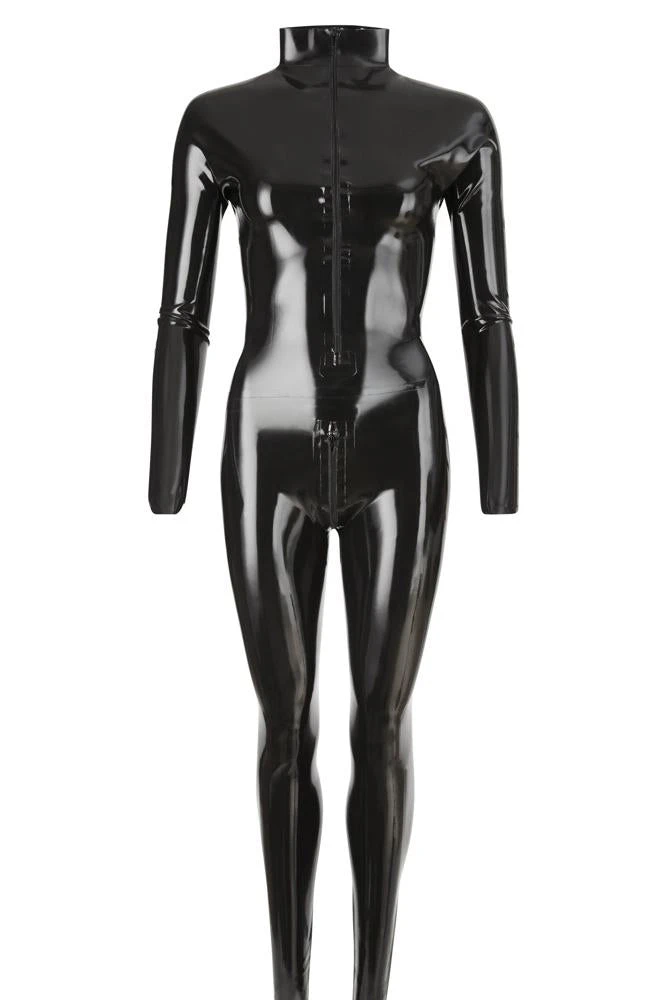 The catsuit with two zips! Slightly tapered, black catsuit with a stand-up collar. The 50 cm long zip at the front and the zip over the crotch can be opened to provide access to the beautiful body underneath.