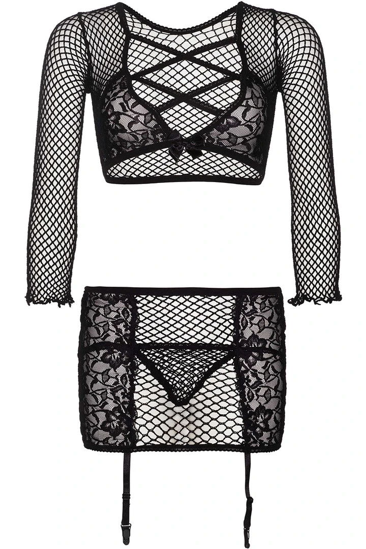 3 Piece Industrial net and lace long sleeved crop top, g-string panty, and a matching strappy back garter skirt.