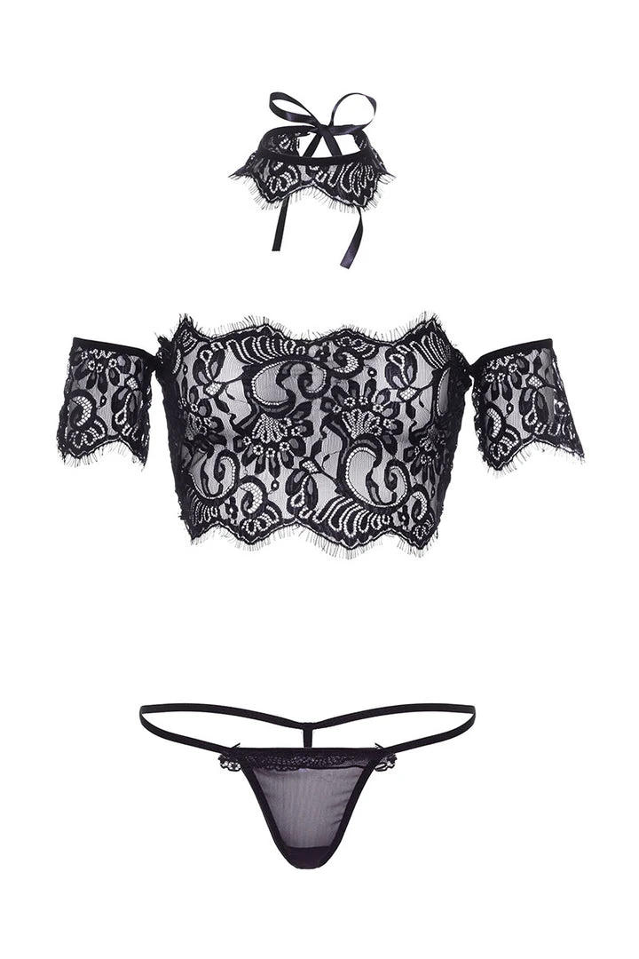 3 Piece Eyelash lace strapless crop top with cuff sleeves, choker, and matching g-string.