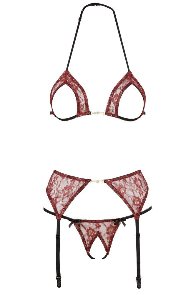 Seduction set: wireless bra with open cups and adjustable halterneck strap, plus a suspender belt with four adjustable suspender straps and a crotchless string. Hook-fasteners. Delicate red lace with gold-coloured threads and rhinestone chains give this lingerie its classy look.