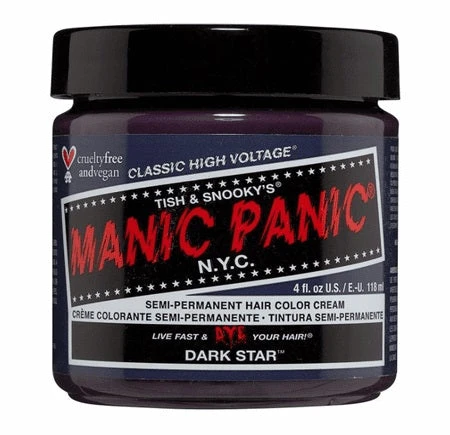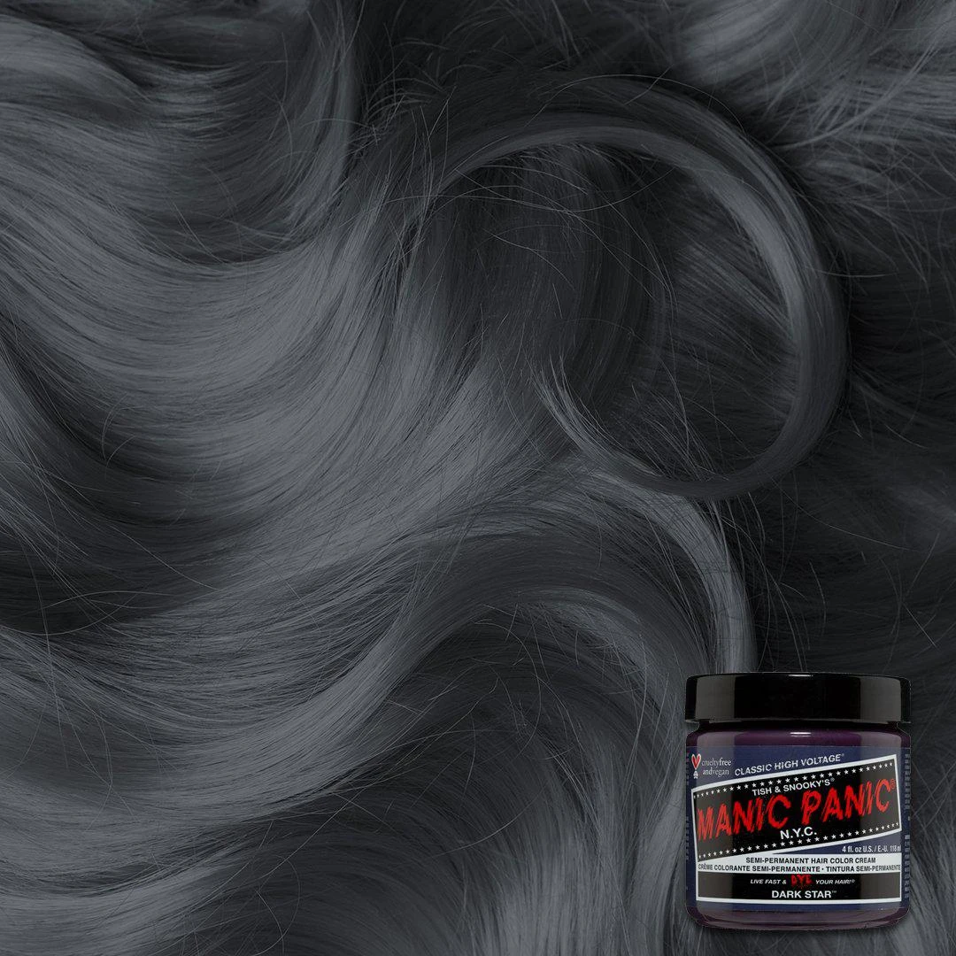 Dark Star is a very deep, slightly purple-toned grey hair dye. For best results, lighten your hair to the lightest level 10 blonde before use. Dark Star may also be used to make your favorite Manic Panic shades deeper for a custom tone.