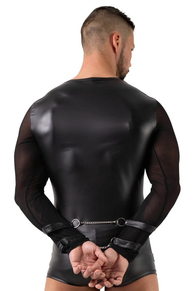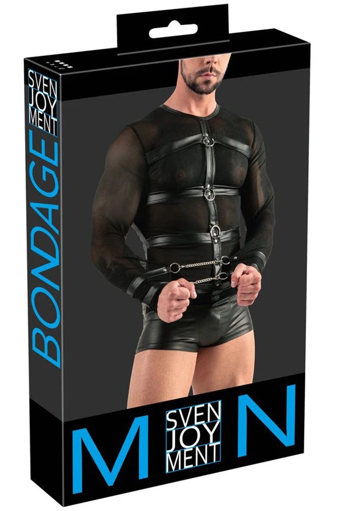 Exclusive, captivating design for soft bondage games! Long sleeve shirt from Svenjoyment Bondage made out of soft, stretchy powernet with a sewn-on harness at the front. The harness has decorative rings on it. The back of the shirt is made entirely out of trendy matte look material. The long powernet sleeves have sewn-on matte look restraints. The included short connection chain with snap hooks can be attached to the rings on the restraints.