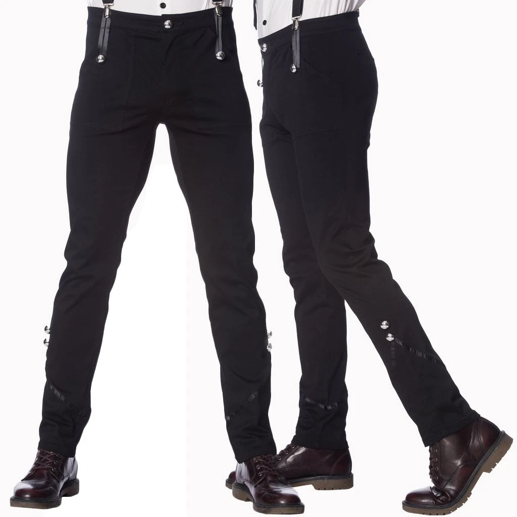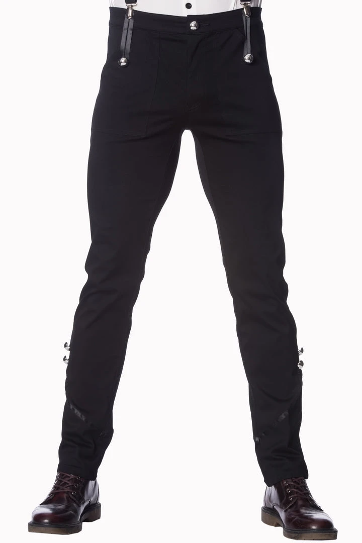 Banned Mens Military Style Dress Pants with Black Satin Ribbon side stripe detail and Black elastic braces / suspenders.