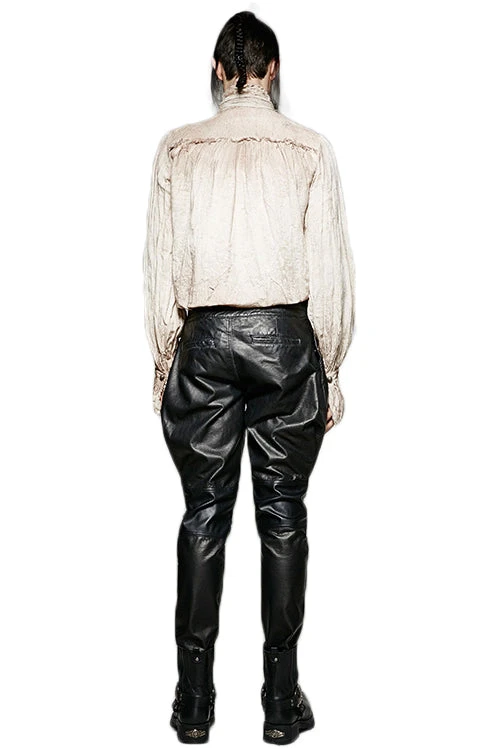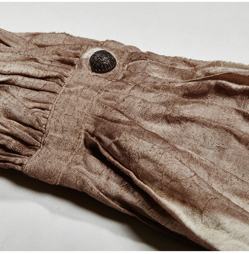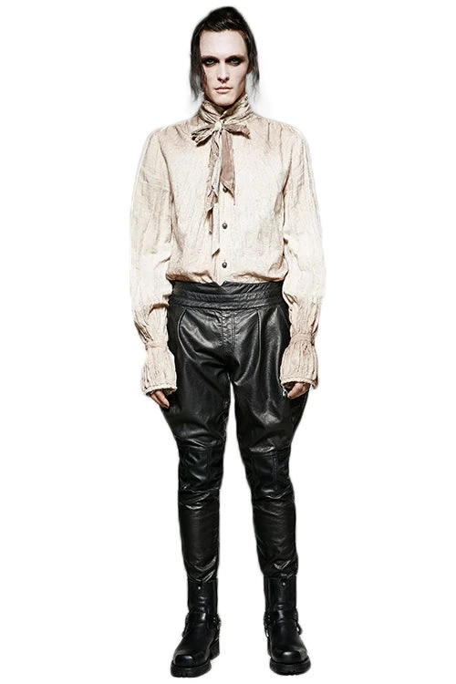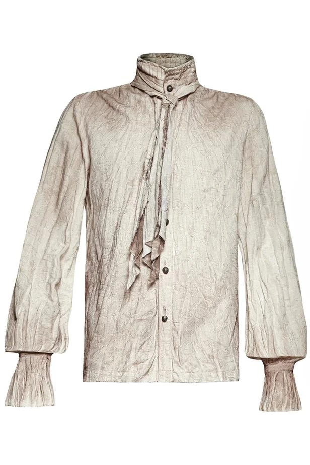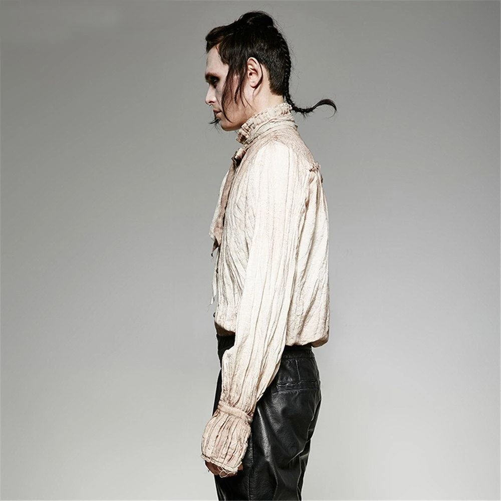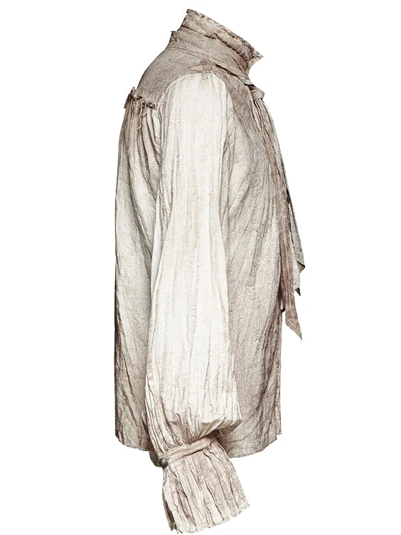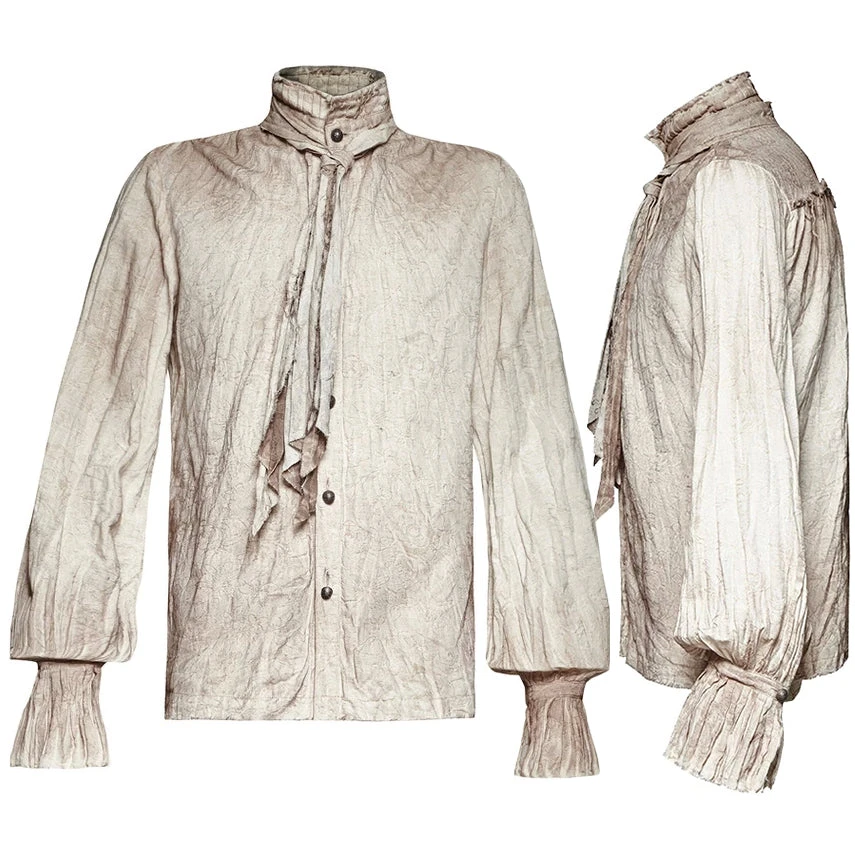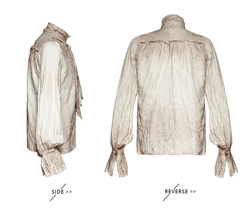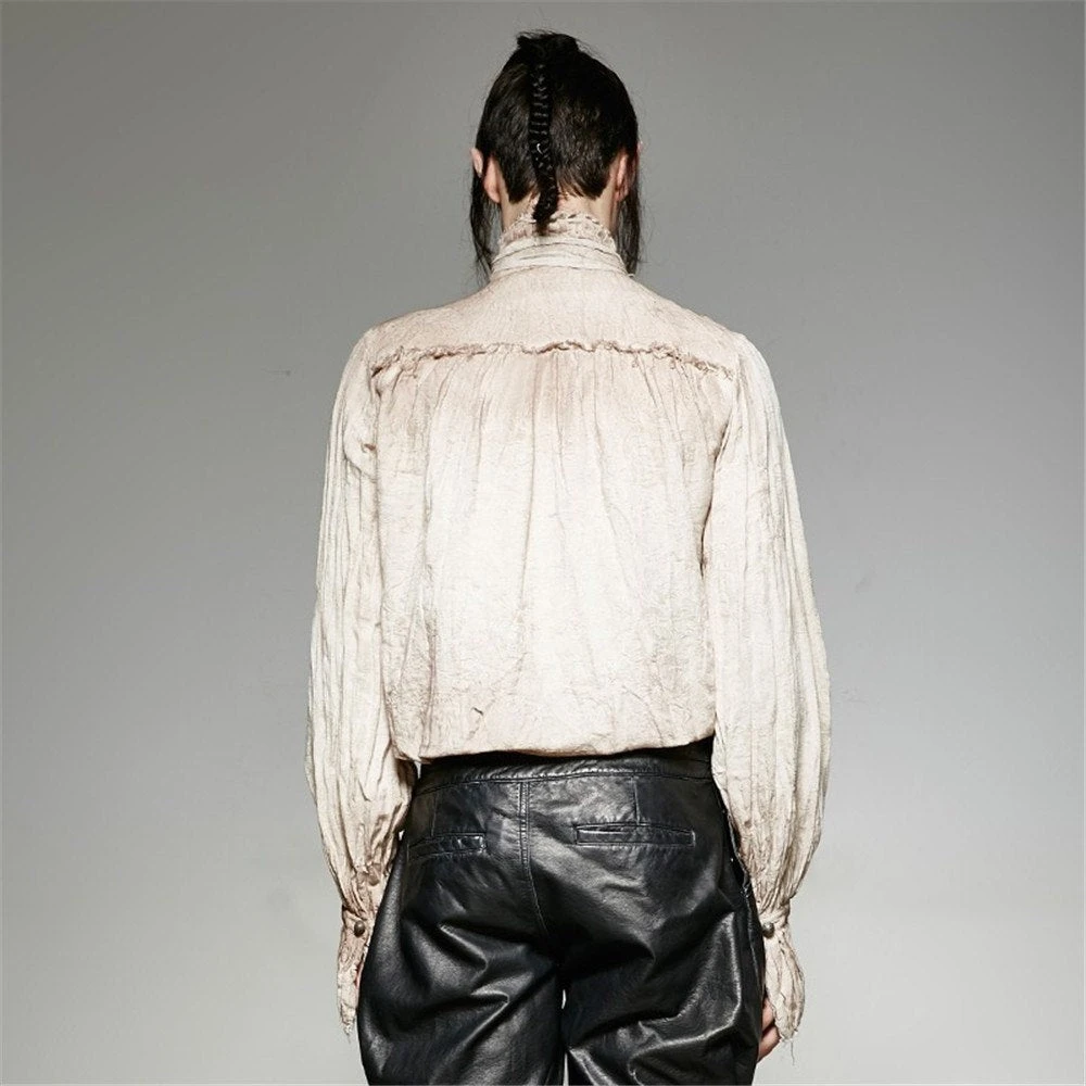 Gothic Vintage Steampunk style white beige stonewash shirt with bishop style sleeves, wide cuffs and buttoned collar.