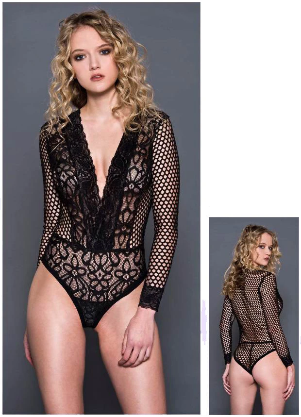 Flower lace teddy with long fishnet sleeves and fishnet back.