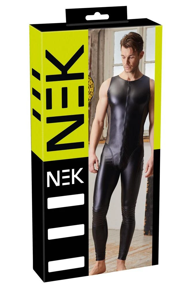 Fits like a second skin! A stretchy, narrow jumpsuit in a biker style with striking stitched parts over the knees. There are transparent net inserts at either side of the jumpsuit. With a 2-way zip that starts at the neck, goes over the crotch and stops at the top of the buttocks. Black. Beautiful matte look.