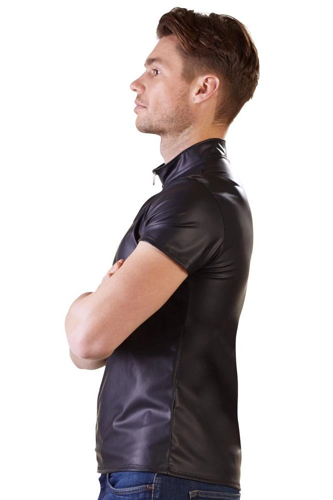 Matte and cool! This black shirt with short sleeves and a small stand-up collar is quite simple and classic, but it’s still way more exciting than a normal shirt. Why’s that? The matte look emphasises your muscles in a subtle way so that your partner will find it really hard to resist unzipping the full-length front zip as quick as a flash so that they can finally see what’s underneath.
