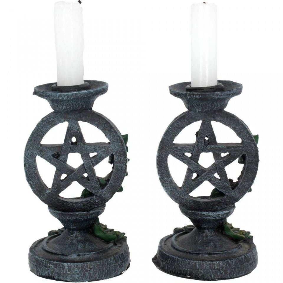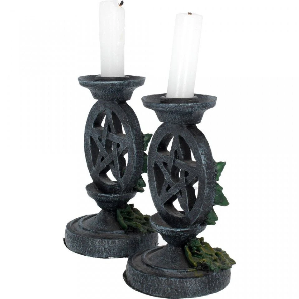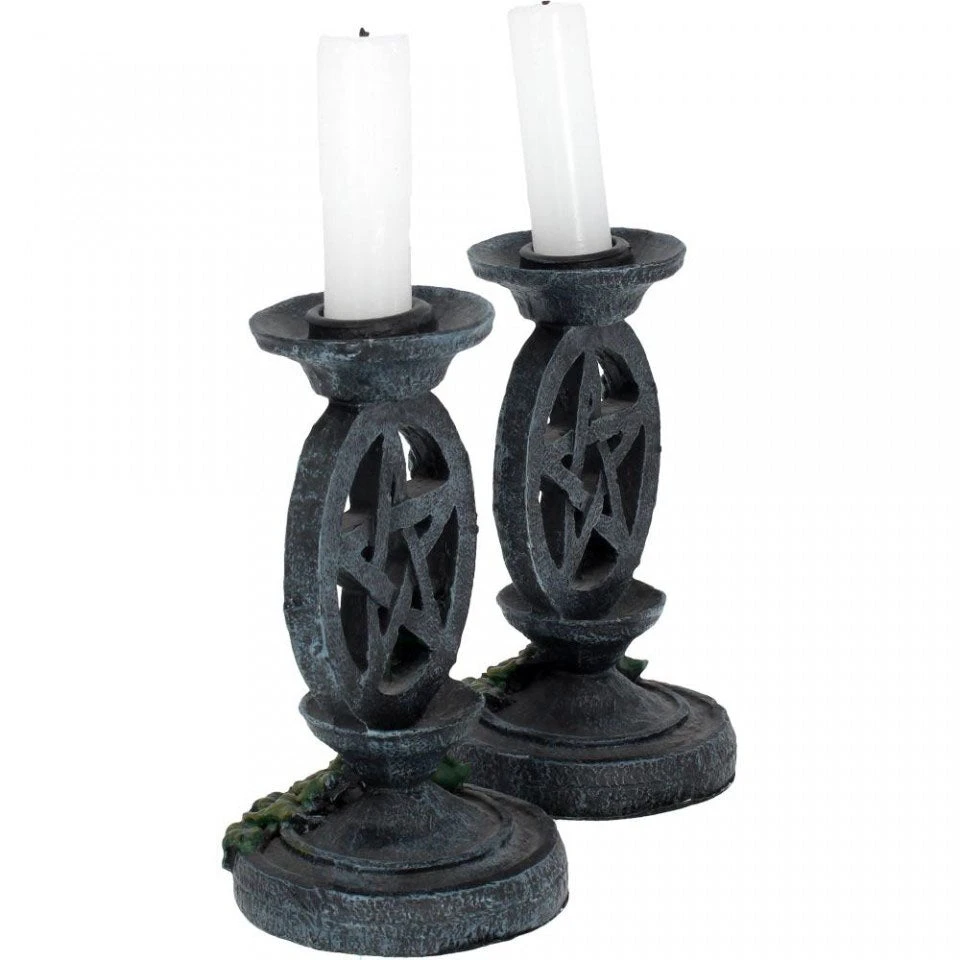 Entwined in climbing ivy, this pair of candlesticks are perfect for adding a magical touch to any dining table or living room. They are cast in high-quality resin and rise to include a circle enclosing a pentagram, covered with tendrils of ivy. Perfect for a dining table, a bedroom, or an altar, or for simply turning down the lights and setting a more relaxed mood, this set of 2 candlestick holders is a wonderful gift for the mystic or romantic in your life.