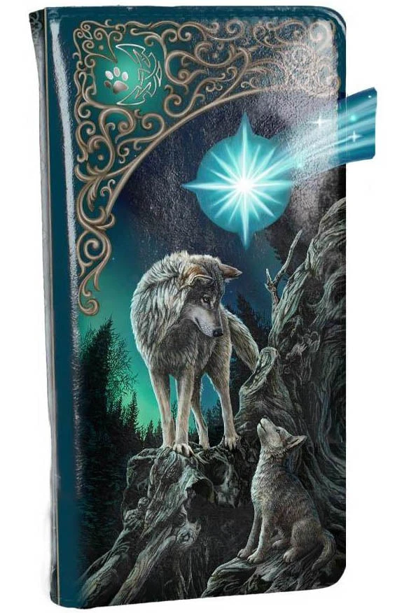 From the untamed imagination of world-famous wildlife and fantasy artist Lisa Parker. Beneath a clear starlit sky, an adult wolf stands on an ancient, gnarled tree root, looking down at their pup. The pup sits and looks up at them, as if seeking guidance, reassurance and protection. Behind them, the aurora borealis tinges the sky green, the silhouettes of fir trees reaching up. Beautiful embossed detailing enhances the magic and creates a striking 3D effect.