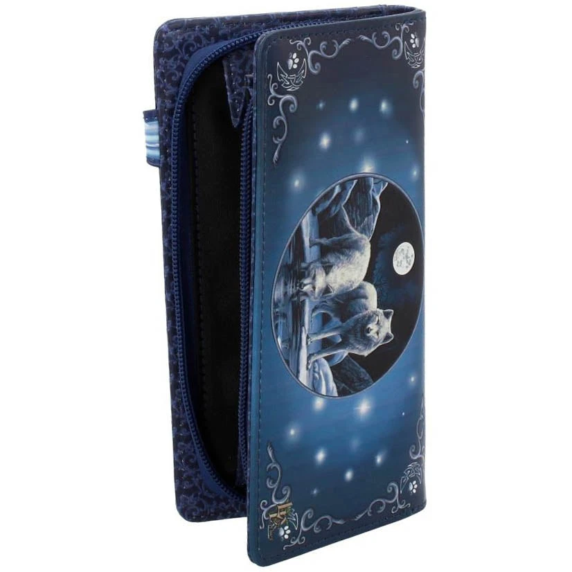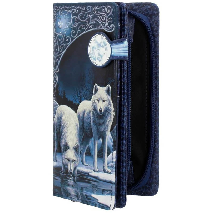 Lisa Parker brings us this stunning embossed purse featuring Warriors of Winter artwork. Two white wolves stand in a frozen landscape in front of a pool. One stands alert and vigilant, the other steps into the pool to drink from it but still looks straight ahead. With embossed detailing creating a 3D effect, this purse is the perfect for anyone who feels the call of the wild.