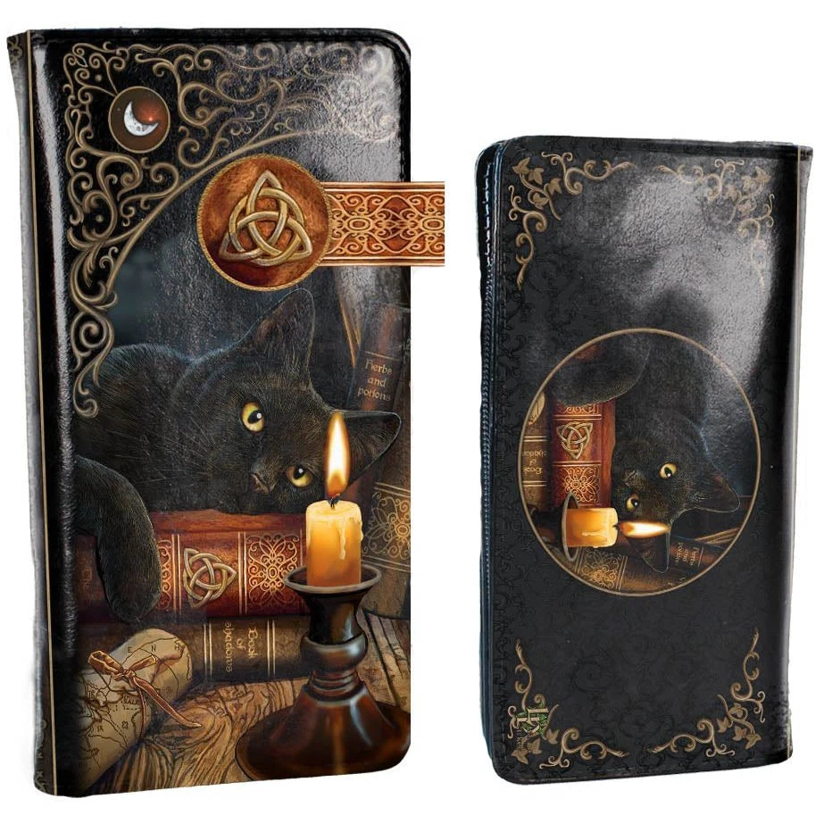 The talented Lisa Parker brings us this beautiful embossed Cat purse featuring her Witching Hour artwork. A black cat stares at a flickering candle, surrounded by books of forbidden and mystical knowledge. The embossed detailing enhances the artwork, creating a striking 3D effect.