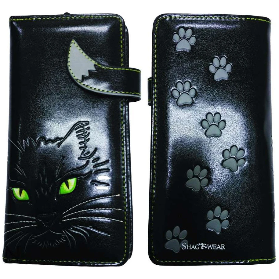 On a black background, the outline of a feline face can be seen, staring at you with piercing green eyes even as it blends into its surroundings. The strap holding the purse closed takes the form of the cat’s swishing tail. On the back, grey pawprints travel the length of the purse, tracking the path of the cat on its way to cause some mischief. Stylish and practical, this purse can fit in any handbag while still holding all it needs to.