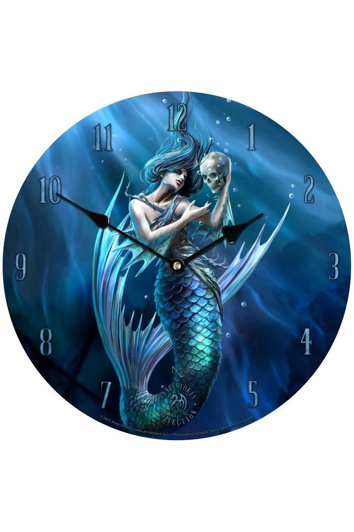 The life blood clock features a mermaid floating under water holding a human skull.
