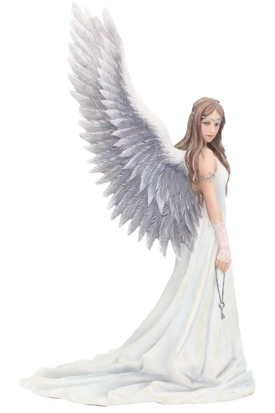 This enchanting angel figurine comes from the imagination of world-famous Gothic and Fantasy artist Anne Stokes. Standing tall, this chestnut-haired angel looks to her right, her long hair flowing over her shoulders past her metal diadem. Her right hand hangs down by her side, holding an iron key by a chain as her long white dress flows down and along the ground behind her. Long white wings stretch out, erupting from between her shoulders. Cast in the finest resin before being lovingly hand-painted, this enchanting angel figurine is a fantastic gift for any who feel they need some guidance in their life.