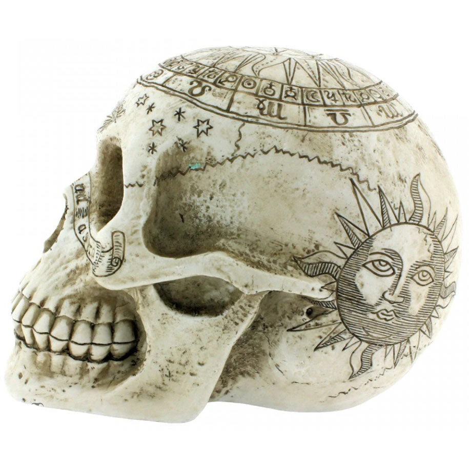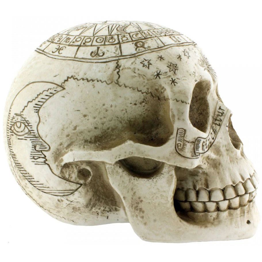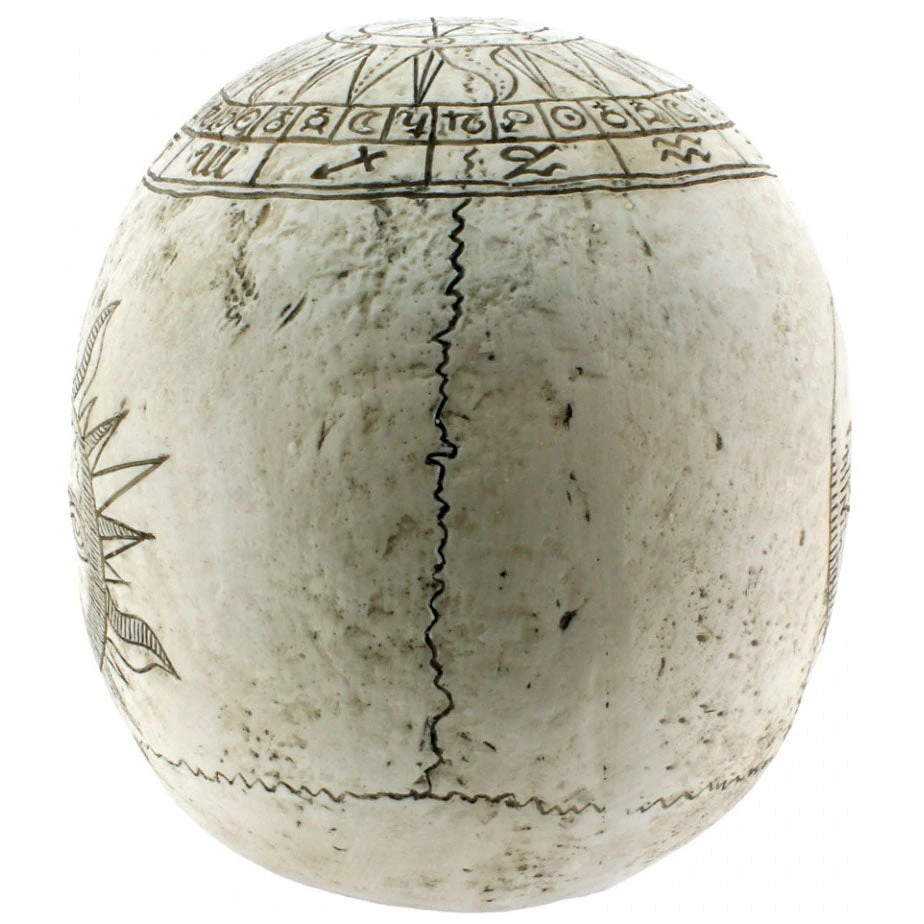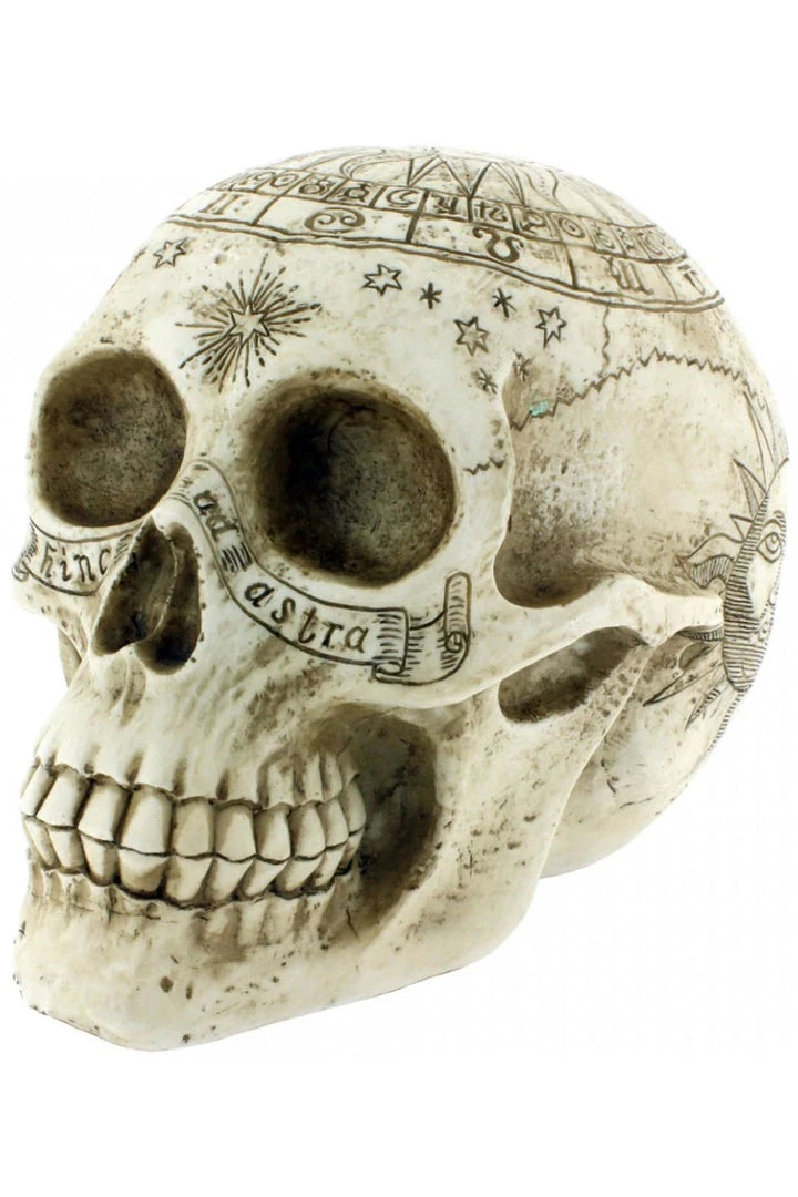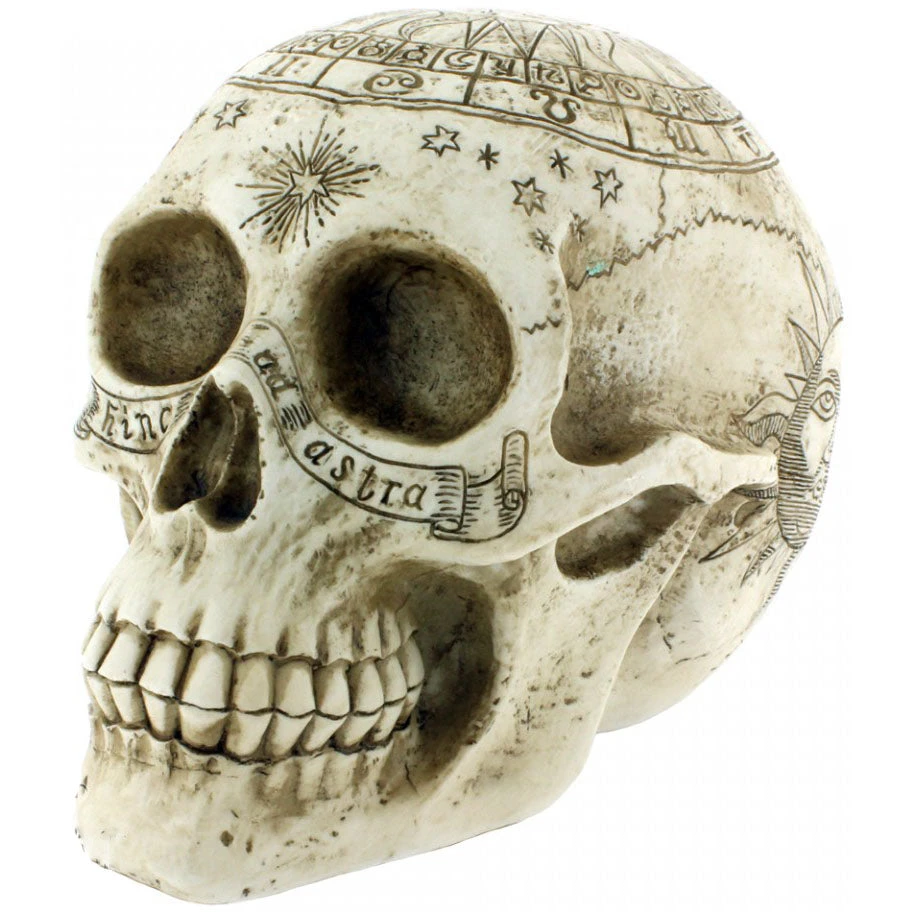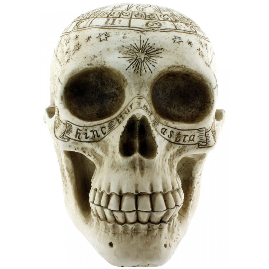 This realistic human skull has been intricately engraved with the zodiac circle, small constellations of starts and also a sun and moon on opposing sides. Over the bridge of the nose there is a thin scroll which is home to the words “Hinc itur ad astra”, meaning “Here we go to the stars”. Cast in the finest resin before being carefully hand-painted, this piece is perfect for those of us who love to gaze at the stars.