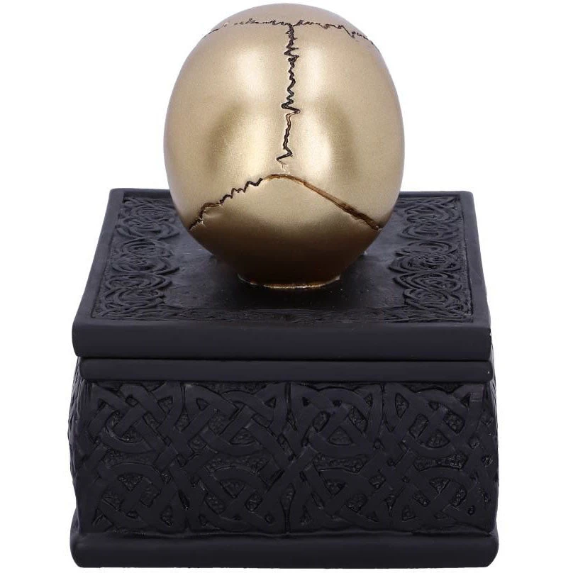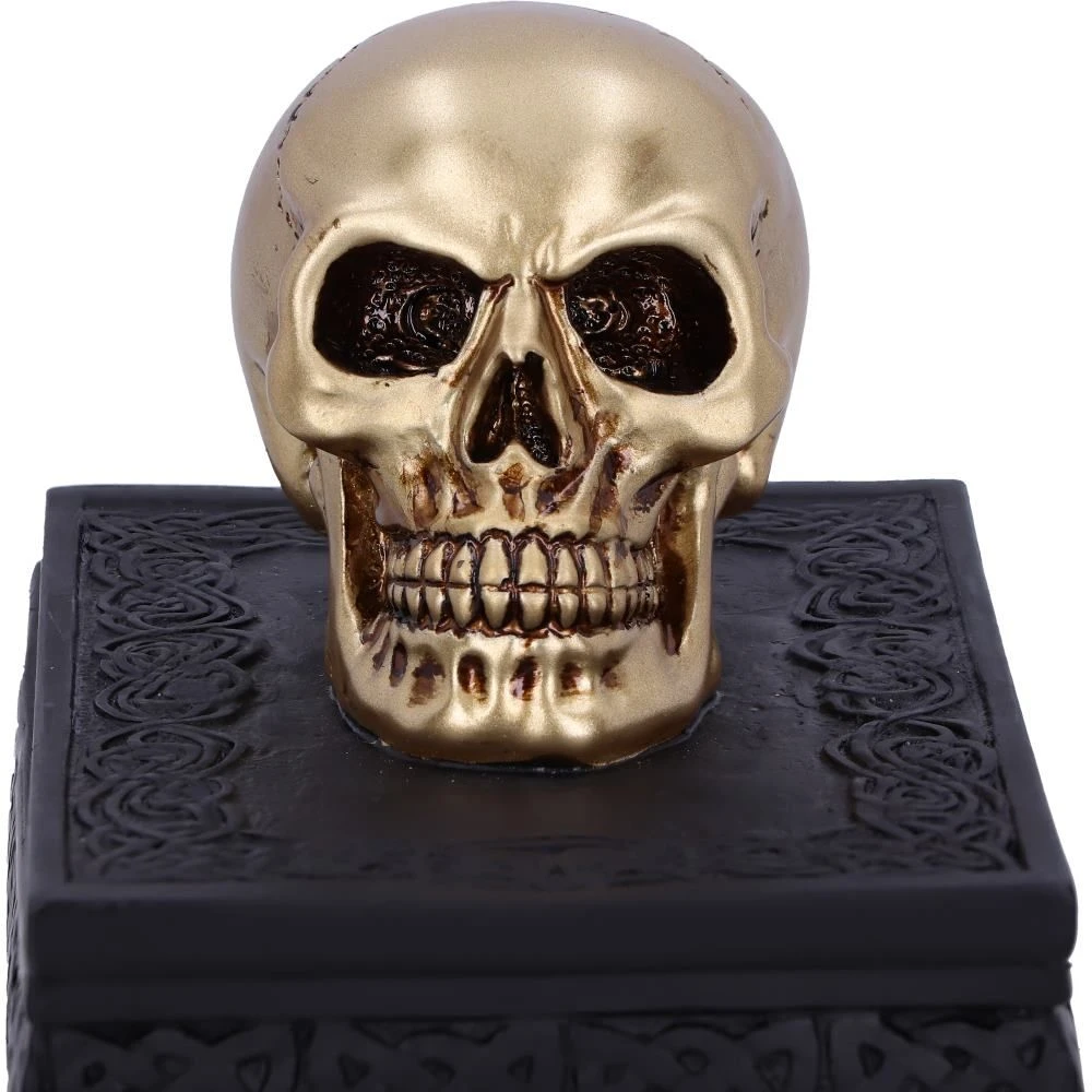 This expertly crafted box will bring macabre opulence to any room! Sat on a large black box, covered in Celtic patterns, is a small golden skull, simple yet strikingly stylish. Lift the skull upwards to reveal the perfect place to store all of your treasure. Cast in the finest resin before being expertly hand-painted, this piece is perfect for any lover of the macabre.