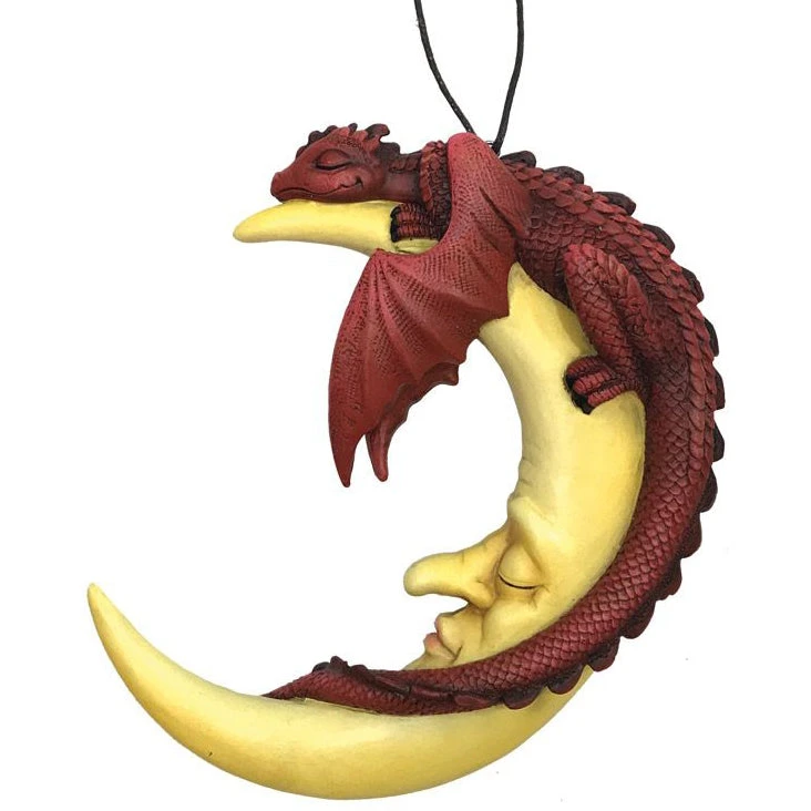 Red Crescent Slumber: Atop a dormant yellow Crescent Moon rests an equally lethargic dark-red Dragon, its wings drape off each side as it clutches to the Moon’s surface with its claws and tail. This hanging figurine will make a perfect addition to any Lunar or Dragon enthusiasts collection.