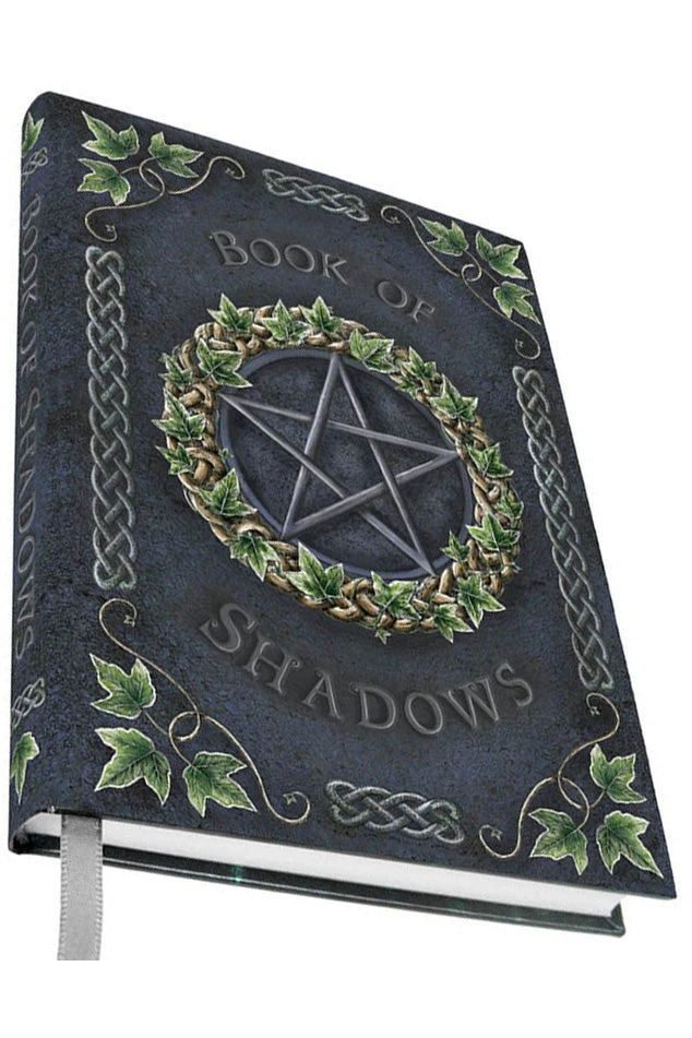 A large silver Pentagram, surrounded by Ivy, takes pride of place, framed by the words “Book of Shadows”. Trio’s of Ivy are placed in each corner and are connected by Celtic knot patterns. This portable journal is made of high-quality paper and has a silver ribbon to keep your place.