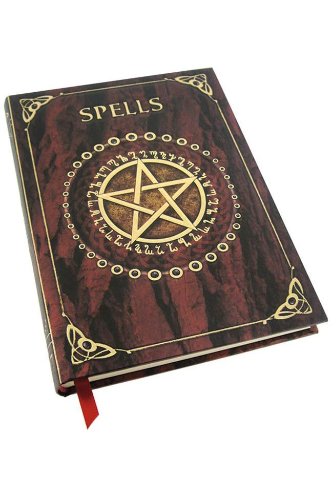 A large golden Pentagram takes pride of place underneath the word ‘Spells’. The design is bordered by an elegant gold pattern that becomes more elaborate at each corner, and is backed by a marbled red background. This portable journal is made of high-quality paper and has a red ribbon to keep your place.